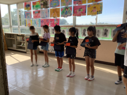 ・「おはようございます。」今日も、気持ちの良い挨拶からスタートする子どもたち。朝の支度を済ますと、集会場に集まり実行委員を中心に朝の集いをしました。ラジオ体操をして、体全身を動かしました。
