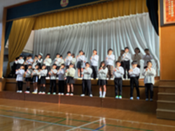 ・爽やかな歌声、心弾む音色のリコーダー奏、全校から大きな拍手が送られたのは、音楽朝会でした。本日の午後に戸塚区児童音楽会に参加する合奏と合唱を全校に披露しました。ステージ上に立つ姿から、一人ひとりの思いを感じるほど凛々しい姿でした。参観してくださった保護者の皆様ありがとうございました。