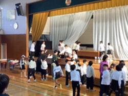 ・音楽朝会が終わると、全校の退場に合わせて3年生が合奏をしました。とても軽やかな曲に合わせて退場ができ、清々しい気持ちになりました。その後、ステージ下に用意した発表用の台を片付けるなど、最後まで自分たちの役割をやり遂げる姿に心を打たれました。
