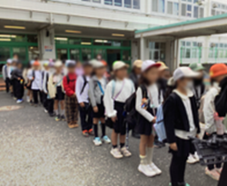 ・遠足の朝にふさわしい気持ちいい秋晴れが子どもたちを照らす中、昇降口前で出発式を行いました。2年生が中心となって会を進めました。1年生代表の言葉では「みんなでお弁当を食べるのが楽しみ」、2年生代表の言葉では「自分のめあてである1年生を楽しませること」をみんなに伝えると、大きな拍手が送られました。
