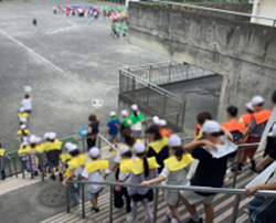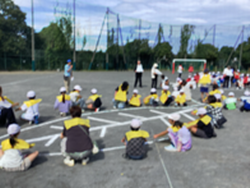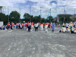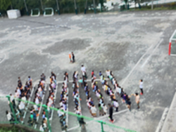 ・今日は、保護者の方、地域の方、キッズクラブの方総勢100名と一緒に航空写真撮影を行いました。始めに、保健委員会が考えたオープニングセレモニーを行い、みんなの気持ちを一つにしました。