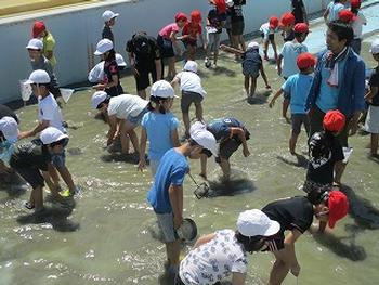 プールを清掃する前に、2年生がヤゴ捕りをしました