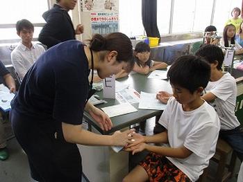 続いて手洗い実験です。汚れの代わりの薬品を手に擦り込んで…