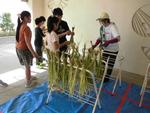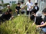 5年生が横浜エクセレンスとミツハシライスに提供していただいた「横浜武道米」の稲刈りをしました。横浜エクセレンスとミツハシライスのスタッフさんにお越しいただき、一緒に稲刈りをします。ハサミで切って整え、天日干しできるように棚に並べていきます。
