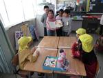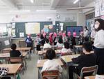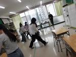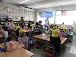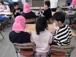 3校時は低学年の多文化共生授業です。今日は中国上海出身の先生が中国式リズム体操を教えてくれました。始めはゆっくりしたリズムなので簡単に思えた動きも、早くなるに連れて付いていくのがやっとです。最後は何が何だか分からない動きになって笑い転げる子どもたちでした。