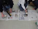子どもたちは図工室や教室で版画の制作に取り組んでいます。5年生は彫刻刀で板を彫り、動物や魚、架空のキャラクターなどを刷っていました。3年生も廊下にインクを並べて印刷中。洋服に付けないように気を付けてください。