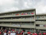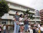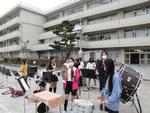 今日は朝雨が降っていたため、グランドコンディションが悪く全体練習は放送による応援練習に変更です。応援団の副団長が放送室から指示を出し、団員が1年生~3年生の教室で実際に応援の手本を見せて全校応援です。応援歌が学校中に響き渡りました。