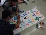 昼休みもMYスポ準備です。図工室では120周年ロゴの制作、ホールでは応援団の話し合いと休み時間返上で真剣に取り組む子どもたちです。