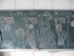手作りの看板前を通って登校します。今年は18の国や地域の旗が並びました。教室の黒板にはone-pieceを思わせる絵が・・・。正門前では育友会、おやじたちの会、地域協働本部、青少年指導員、スポーツ推進委員の皆様の打ち合わせ。