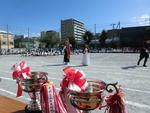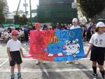 120周年MYワールドくんが描かれた王冠を被って演技する1,2年生