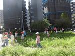 1年生が生活科で虫さがしに出かけました。学校の花壇や草むらではいろいろな虫を見つけていますが、今日は阪東橋公園にお出かけしての虫さがしです。とはいえ、都心部の学校から自然に恵まれた公園に歩いて行くことは難しく、マンションと高速道路に囲まれた都市型公園で虫さがしをします。