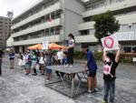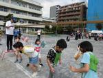 晴天に恵まれて今年も健民祭が盛大に行われました。開会式には各町内会長さんと南区長も参加し、みんなでラジオ体操をしてスタートです。玉入れ、防災リレー、じゃんけん大会、徒競走、○×クイズ、スプーン競技、パン食い競争と大人も子どもも大勢参加し大いに盛り上がりました。300人くらいの参加があったそうです。今年は4年生の有志が○×クイズのプログラムで「防災クイズ」と「南吉田小クイズ」を出題させてもらいました。3年生の時に考えた防災検定クイズからの出題では、「地震の最大震度は7である」「防災備蓄庫の乾パンは2000食以上ある」など回答が分かれる問題も出されていました。休み時間に運動会の練習の合間を縫ってリハーサルをしていました。健民祭に参加した地域の皆様お疲れ様でした。クイズ隊の4年生もありがとうございました。