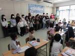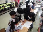 1年生が学校探検をしています。下駄箱の靴の入れ方を確認したり、校庭にお散歩に行って砂遊びをしたりと少しずつ学校に慣れていきます。入学式で紹介したMYワールドくんを探す子もいます。お絵描きタイムでは早くもMYワールドくんを得意げに描きます。あちこち探検して学校のヒミツを発見してください。そして今日も6年生は1年生と関わってお兄さんお姉さんぶりを発揮します。