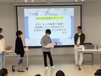 助産師さんとして、どのような仕事をしているのか、赤ちゃんを産むお母さんはどんなことを考えているのか、子どもたちは真剣に話を聞き、自分が生まれてきた時にお母さんはどんなことを思っていたのかを想像しているようでした。