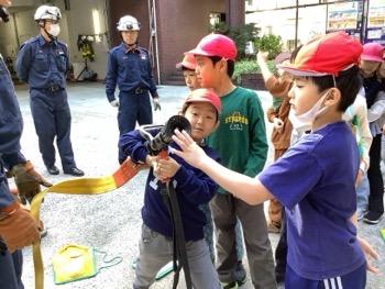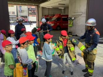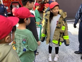 3年生では社会の学習として「火事からまちを守る」という単元で、実際に消防署に見学に行きました。社会科見学はスーパーに行って以来で、ワクワクする気持ちもありつつ、学習という事も忘れずに取り組む姿がありました。特に、消防の装具をつける体験では初めてのことに目を輝かせていました。