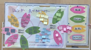 ココカラなないろ会議では、ふりかえりアンケートから出た素敵な気づきを代表者達でさらにふくらませて、「ジェンダー 気づきのフラワー」を作成しました。素敵な気づきの一部を紹介します。