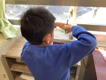 図工「うつしたかたちから」では校内の色々な所のでこぼこを探し、こすり出しをしました。