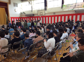 峯小では6年生に事前に「退場の際に演奏してほしい曲」のアンケートをとり、5年生がリコーダー奏で演奏し、見送ります。