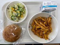 今日の献立:チーズパン 牛乳 ペンネミートソース コーンサラダ