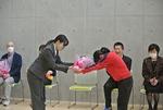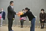 離退任式では、8名の教職員に感謝の気持ちを込めて花束が渡されました。校歌「青い鳥」の歌声が校内に響き渡りました。式が終わってからもあちこちで別れを惜しむ場面が見られました。