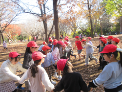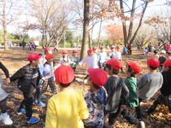 枯葉いっぱいの公園で枯葉を思いっきり飛ばしたり、みんなで手をつないで「はないちもんめ」をしたり。クラスであらかじめ計画したレクを楽しみました。笑顔、笑い声があふれる素敵な時間になりました。