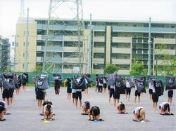 月曜日、9月1日の防災の日に合わせ、総合防災訓練を行いました。放送機器が使えない設定でどのように動けばいいのか考えて行動しました。大型地震が発生した際に、続く余震にも心配があること、耐震化された校舎が実際は安全な場所であることから、「速やかに校庭に避難する」のではなく、「校舎内で身を守る行動をとる」ことを大切にした訓練を行いました。