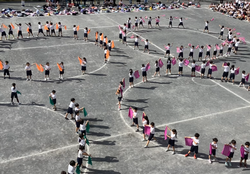 団体競技。1・2年生は玉入れ「ふわキラ玉入れ」・玉運び「はこべ!あおいとりのたまご」の2種目、3・4年生は飛びつき綱引き「輝け!レッツゴーゴー飛びつき綱引き」・台風の目リレー「GO!GO!みのわタイフーン」の2種目、5・6年生は大綱引き「心を燃やせ!大綱引き」・大玉送り「転がせ地球!」の2種目。子どもたちは、どちらかを選択して出場しました。