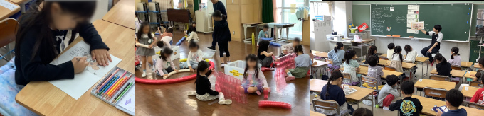 別々の教室に道具遊びやお絵かき、ぬり絵、読書などをできるようにしてあり、1年生が自ら選択して遊ぶ中で新たな生活に適応していきます。