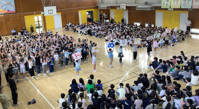 今朝は、全校での「ほたる愛育集会」。5・6年生の委員会活動「ほたる委員会」が主体となって、ほたるの飼育を推進する活動です。
