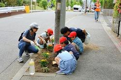 5月18日、20日にPTA本部役員と花壇ボランティアを中心に、森の台小学校周辺の街路樹マスの草取り作業を行っていただいた場所に、2年生がマリーゴールドとポーチュラカを植えこみました。今日も『花いっぱいの会』の方、PTA役員のみなさま、保護者のみなさまの協力をいただきながら、きれいに花が街路樹マスに並びました。