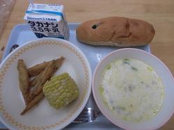 そして、今日の給食はぶどうパン・きびなご・ゆでとうもろこし・クリームスープでした。トウモロコシは甘くてとてもおいしかったです。トウモロコシの粒をスープに入れて、コーンクリームスープにしている子もいました。ごちそうさまでした。