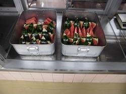 今日の給食は、はいがパン・チリコンカーン・キャベツサラダ・すいかでした。上の写真は調理室での調理風景です。大豆をこんなに大きなお鍋で茹でたり、一つひとつ手作業でスイカを切ってくれたりしていることが伝わってきます。愛情が伝わってくる美味しい給食を、毎日ありがとうございます。