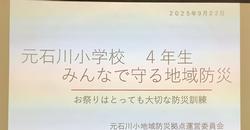 社会科の「自然災害に備えるまちづくり」の学習から、子どもたちは「災害が起きたとき、元石川地区の防災はどうなっているのかな。」と、子どもたちは課題をもちました。地域の方の話をもとに、災害が起きたとき、周りの人を助けるために、自分たちに何ができるかを考える授業でした。
