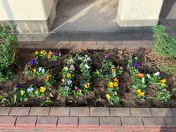 創立50周年をお祝いして、飼育・栽培委員会が花壇にパンジーを植えました。