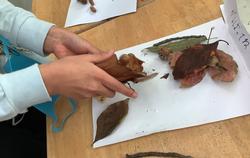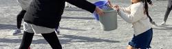 気温がぐんと下がり、学校の木々も紅葉が進んでいます。体育館前のユリノキは、たくさんの葉をレンガの上に落としていて、じゅうたんのようです。その落ち葉で、子どもたちは遊んでいました。
