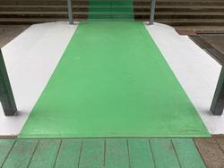 昨年度末から、渡り廊下の工事をしていました。コンクリート部分の補修をしたり、色を塗り直したりして、さわやかな緑色の道ができました。