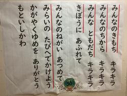 創立50周年を記念して、その『キラキラ』の後のサビの部分を児童から募集しました。20点の応募があり、その中から言葉を選んで、歌詞を決定しました。今日の朝会で、みんなで『キラキラ』を歌いました。