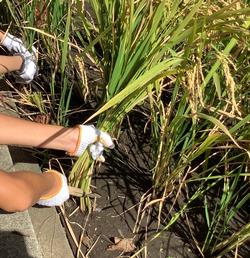 地域の方に、鎌の使い方を教えていただき、稲かりをしました。
