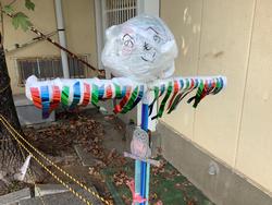 学校田を改めて見ると、こんなにかわいい「かかし」がありました。「かかし」が稲穂を守ってくれたのですね。