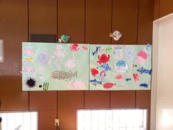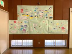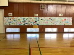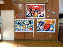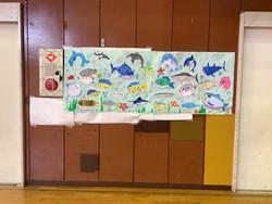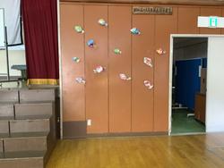 さかなクンをお迎えするために、子どもたちは、体育館を魚の絵や大漁旗で飾りました。