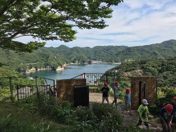 その後無事、南伊豆臨海学園に到着しました。遠くに海が見えますがここは海抜60m程のところにあります。津波などの心配はありません。海から高さ30m程のところにある元小学校跡地のグラウンドまで歩いて上る避難訓練です。