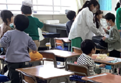 給食では、食缶を一緒に持ったり、配膳の仕方を教えたりしています。