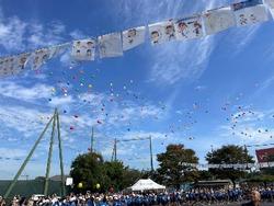 10月18日(土) 素晴らしい秋空の下、永谷スポーツフェスティバル2025が開催されました。 今年のスローガンは、「コスモスパワーで咲かせよう!伝説のつ永り花畑!」でした。 コ・・・「コ」ころを一つに! ス・・・ベ「ス」トをつくす! モ・・・自信を「モ」って演技・競技 ス・・・「ス」マイル この4つのパワーを集めて、小さな花が集まってできるコスモスのつながり花畑をさかせようというめあてでした。 今年の運動会は、つながりを意識して、全員おそろいの50周年記念Tシャツを着るだけでなく、なかよし班で座席を設定したり、ペアーズで競技をしたり、2学年で演技を披露したりしました。当日までにたくさんの交流の時間を設けました。これも、50周年の学校スローガン「もっとつながる永谷小! 作ろう50GOスターパズル!」に向けての取組です。 写真は、日頃お世話になっている地域の皆さんと、全校児童で一緒に挙げた、風船セレモニーの様子です。この風船のように、子どもたちの明るい未来に向けてはばたいて永谷小を巣立っていってほしいと願っています。