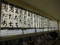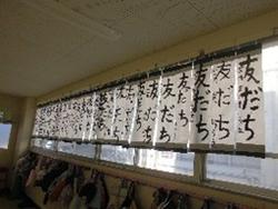 【3年生 書初めに挑戦しました!】 初めての毛筆による書初めを体育館で行いました。体育館に新聞紙を敷き、「友だち」の文字をのびのびと書いていました。冬休みの宿題で取り組んできた児童もいて、自信をもって取り組む姿が見られました。4月は初めて毛筆の筆をもつ子がほとんどでしたが、廊下を通るたびにこの一年間の成長を感じています。