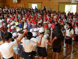 14日、音楽朝会がありました。運動会で歌う歌を練習するため、赤組と白組にわかれて並びました。今月の歌は運動会のテーマ曲「ゴーゴーゴー」です。職員室にも1年生が朝の時間や音楽で歌っている歌が聞こえてくることがあります。音楽朝会では、閉会式で歌う「校歌」を練習した後、赤組と白組が向かい合って「ゴーゴーゴー」を歌いました。お互いの組が負けまいと元気いっぱい歌うことができました。