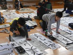 3年生に引き続き、5年生が体育館で書き初めを行いました。5年生ともなると手際よく準備を始め、始めの合図とともに体育館が静まり、張りつめた空気となりました。いつもの紙とは違い字のバランスをとるのが難しそうでしたが、冬休みに取り組んだことを生かして素晴らしい字が並びました。