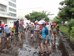 5年生が、社会科学習、総合的な学習の一環として、学校の田んぼで米作りに挑戦しています。7日は、代掻きを行いました。レッドキャップスさんが事前に田んぼを耕してくれていましたので、固まった土を子どもたちの足でくだいてならす作業を行いました。初めは、泥に足をおそるおそる入れていましたが、泥の感触が楽くなり友達と競い合いながら代掻きをしていました。