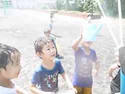 1年生が生活科で水をテーマに学習しています。雨の日は、雨の日探検でみずたまりやカタツムリ探し、梅雨の合間の晴れの日は、自分たちでいろいろな容器を工夫し水をだす道具をつくって楽しんでいます。お家の方の協力もあり、着替え持参でびしょ濡れになっても思いっきり遊ぶ姿がみられます。