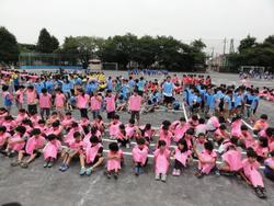 本校は、本年65周年を迎えることを記念して、全校で航空写真撮影を行いました。65周年マークを全校より募集をして決定、校庭にマークを描き、マークの上に立ち、色エプロンをつけて航空写真撮影を行いました。低学年と高学年に分かれての全校写真も撮りました。