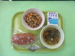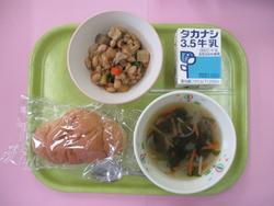 今日のメニューは、ロールパン、変わり五目豆、わかめスープ、牛乳です。